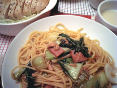 チンゲン菜とベーコンの醤油バターパスタ