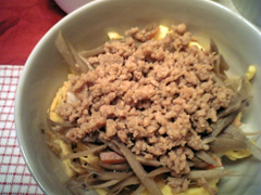 2.鶏ミンチを醤油・砂糖・酒・しょうがで味付けそぼろをつくる。